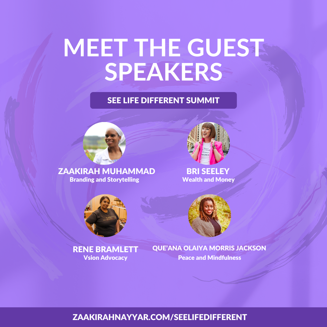 The See Life Different Summit is your gateway to personal and professional transformation. 2024 brought together voices, lessons, and energy that still resonate today. Now it’s your turn to experience it—at your own pace, on your own terms, designed to inspire, empower, and equip you to see life differently—through storytelling, strategy, and soul work. Speakers and speaker topics: Bri Seeley on unleashing your inner wealth creation, Que’Ana Morris Jackson on ways to love yourself, Renee Bramlett on Vision and Advocacy, and Zaakirah Muhammad on building your brand on storytelling. One time payment for unlimited replay access Length: 68 minutes, with Playback Speeds options